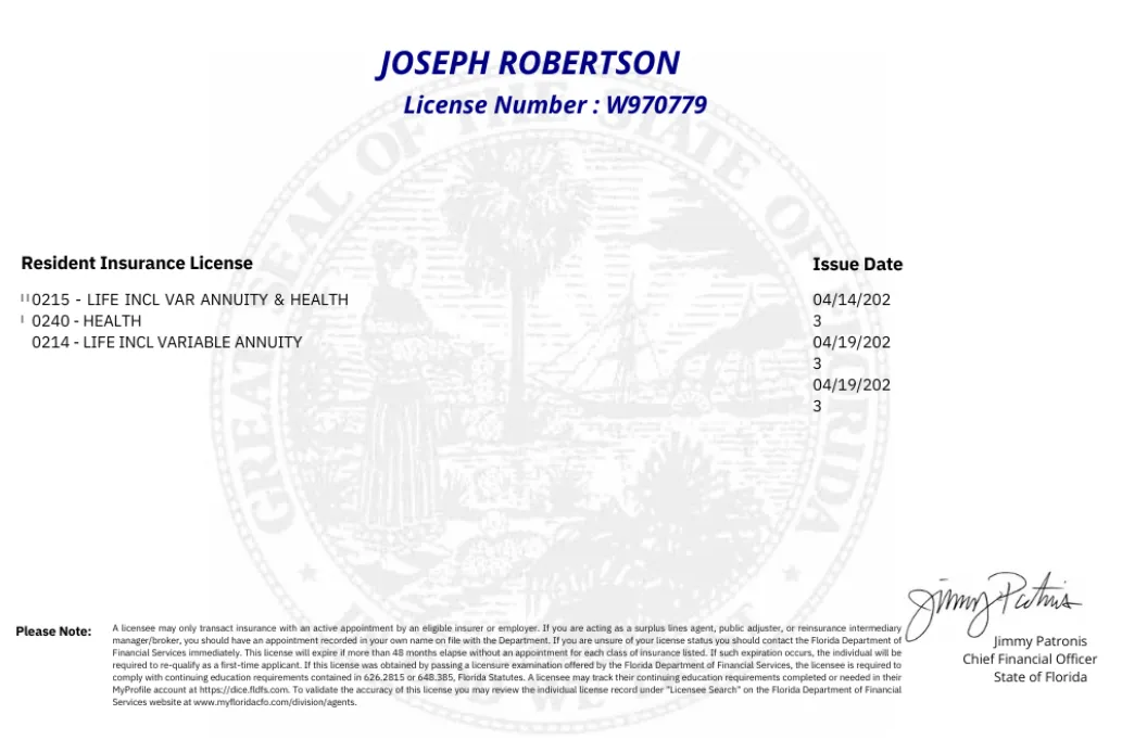 I carry all required state insurance licenses and maintain continuing education certifications. Below are high-resolution images of my primary license and associated credentials for verification.